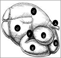 D = Omasum; E = Abomasum; F = Small Intestine Begins